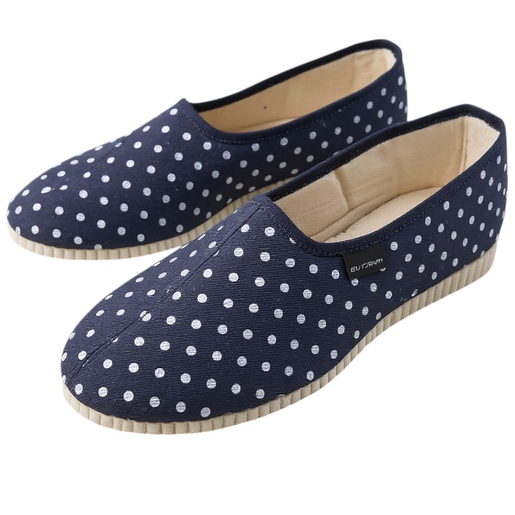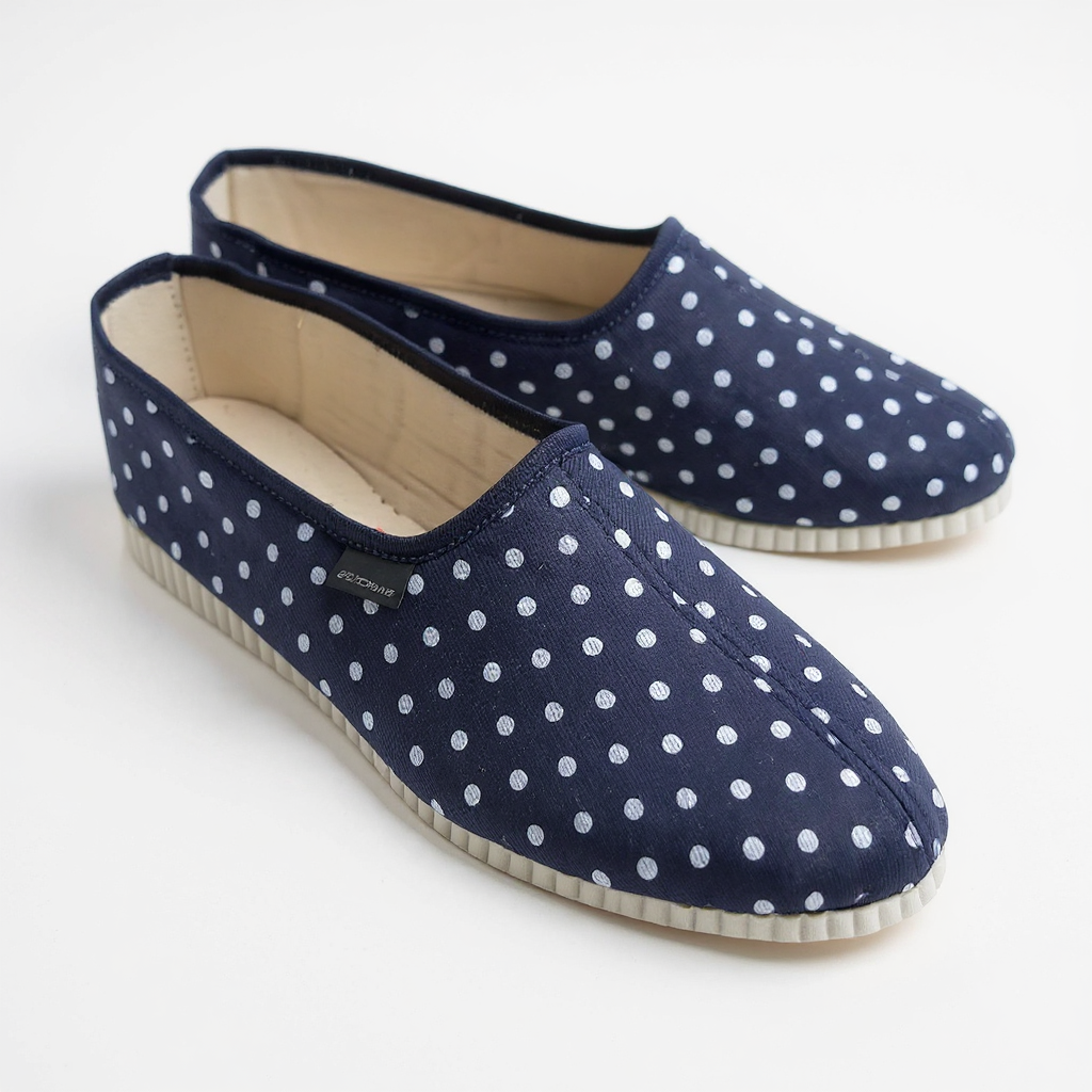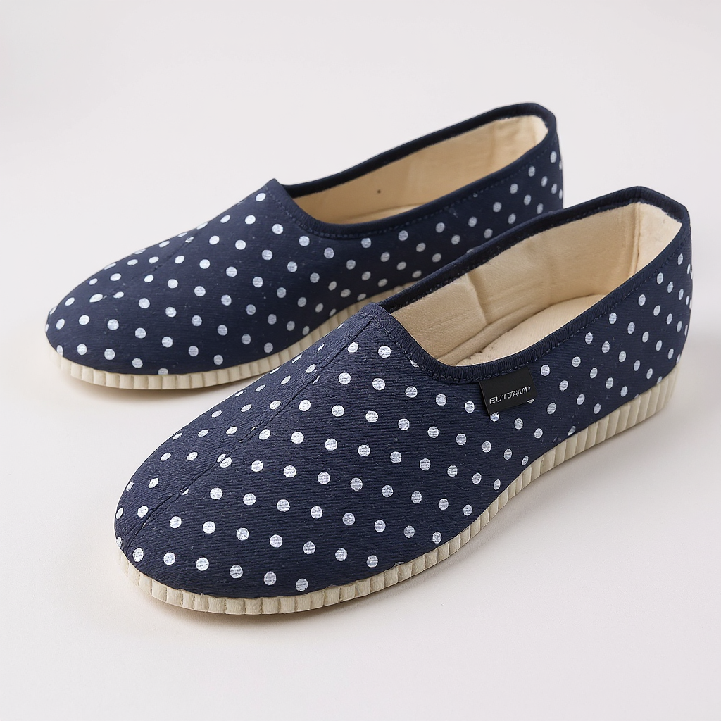 Granatowe kapcie damskie w białe grochy – stylowe bambosze polskiej produkcji